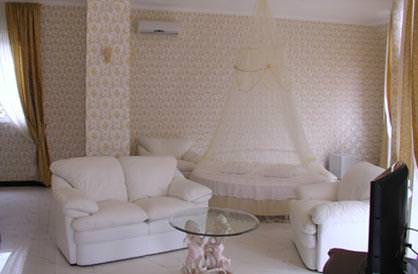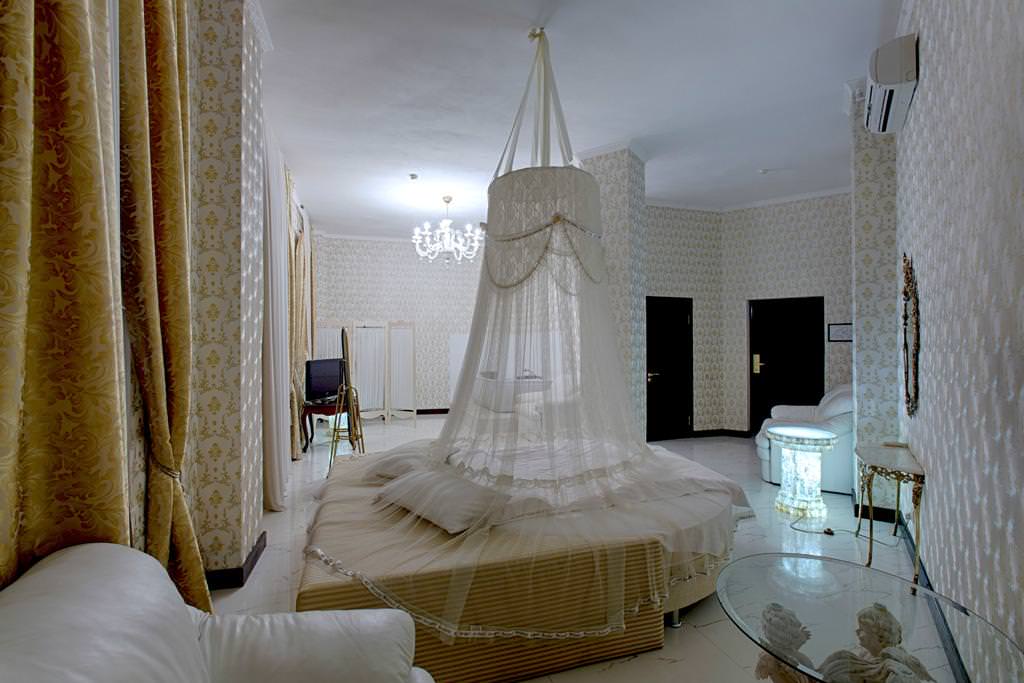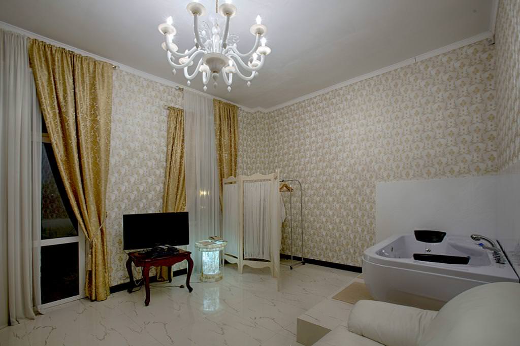 Только в этом номере можно по настоящему почувствовать утонченное изящество подлинной романтики. Эту атмосферу создают предметы интерьера — круглая кровать, белые мягкие кожаные кресла и диван. Особую торжественность придают зеркало с консолью, столик-фонтан решенные в белых и золотых тонах. Пребывание в этом номере оставит у вас самые светлые воспоминания.